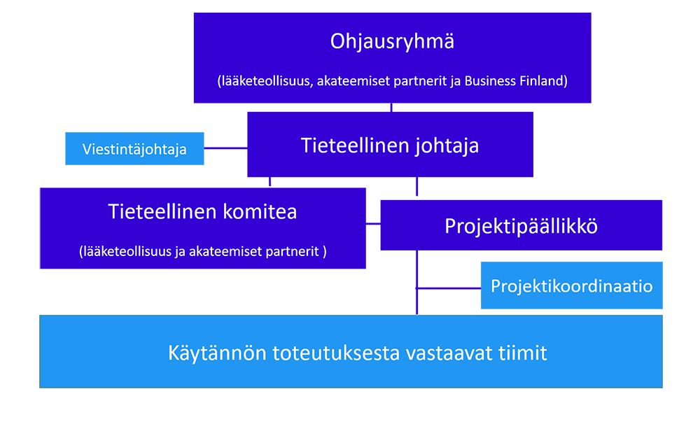 Yllä kuvattu FinnGenin organisaatiomalli on esitetty graafisesti tässä kuvassa: